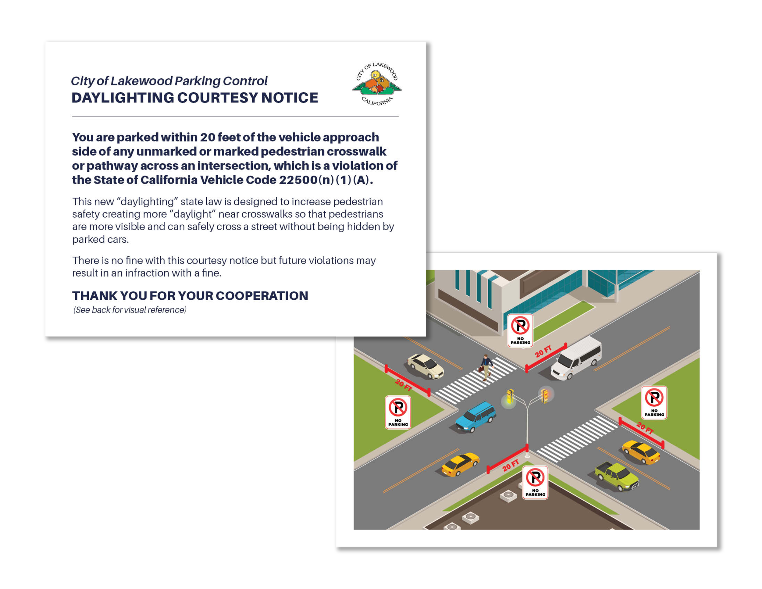 Courtesy notification postcard designed to increase public awareness of daylighting regulations and serve as a preliminary notice of potential vehicle code violations. The reverse side features a clear visual illustration of daylighting rules to improve comprehension and encourage informed compliance.