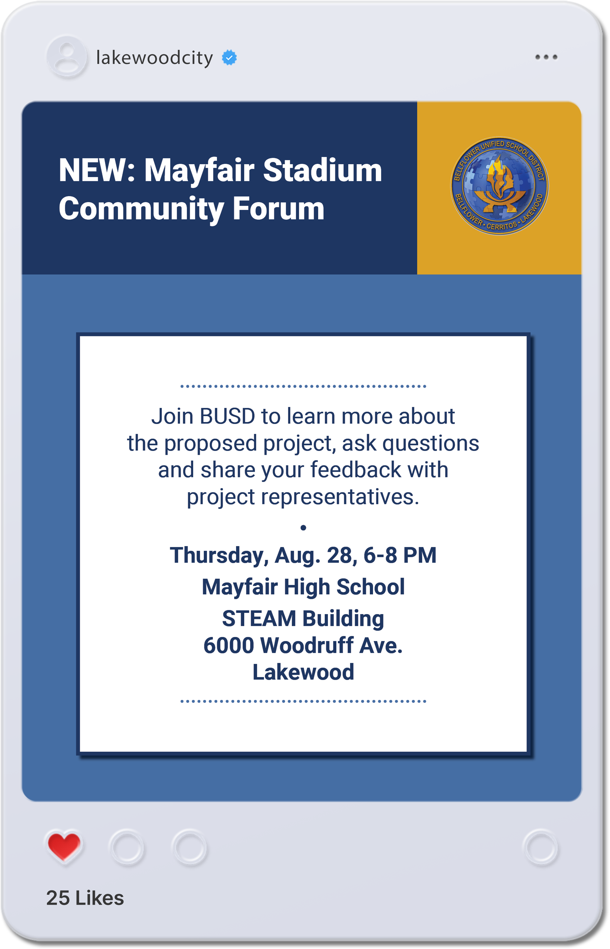 Social media announcement developed to support cross-agency community outreach between the City of Lakewood and Bellflower Unified School District. The two-slide post promoted a public forum regarding the Mayfair Stadium Project, providing residents with clear event details and encouraging civic participation. The post amplified the district’s public forum hosted within city boundaries, reinforcing transparency, stakeholder engagement, and accessible civic information sharing.