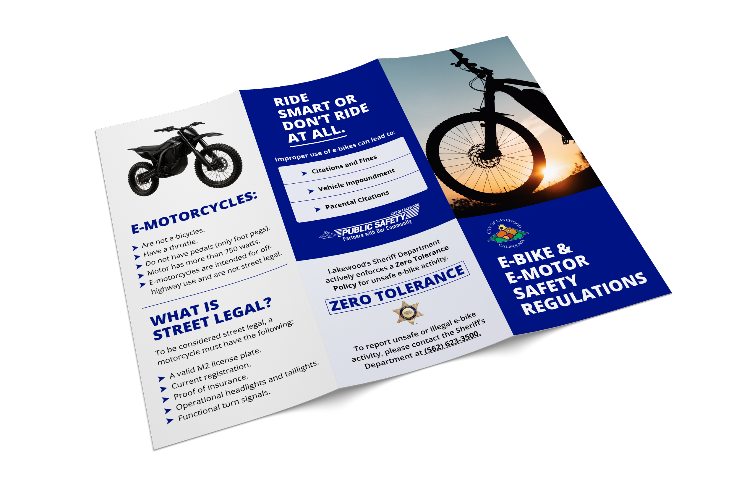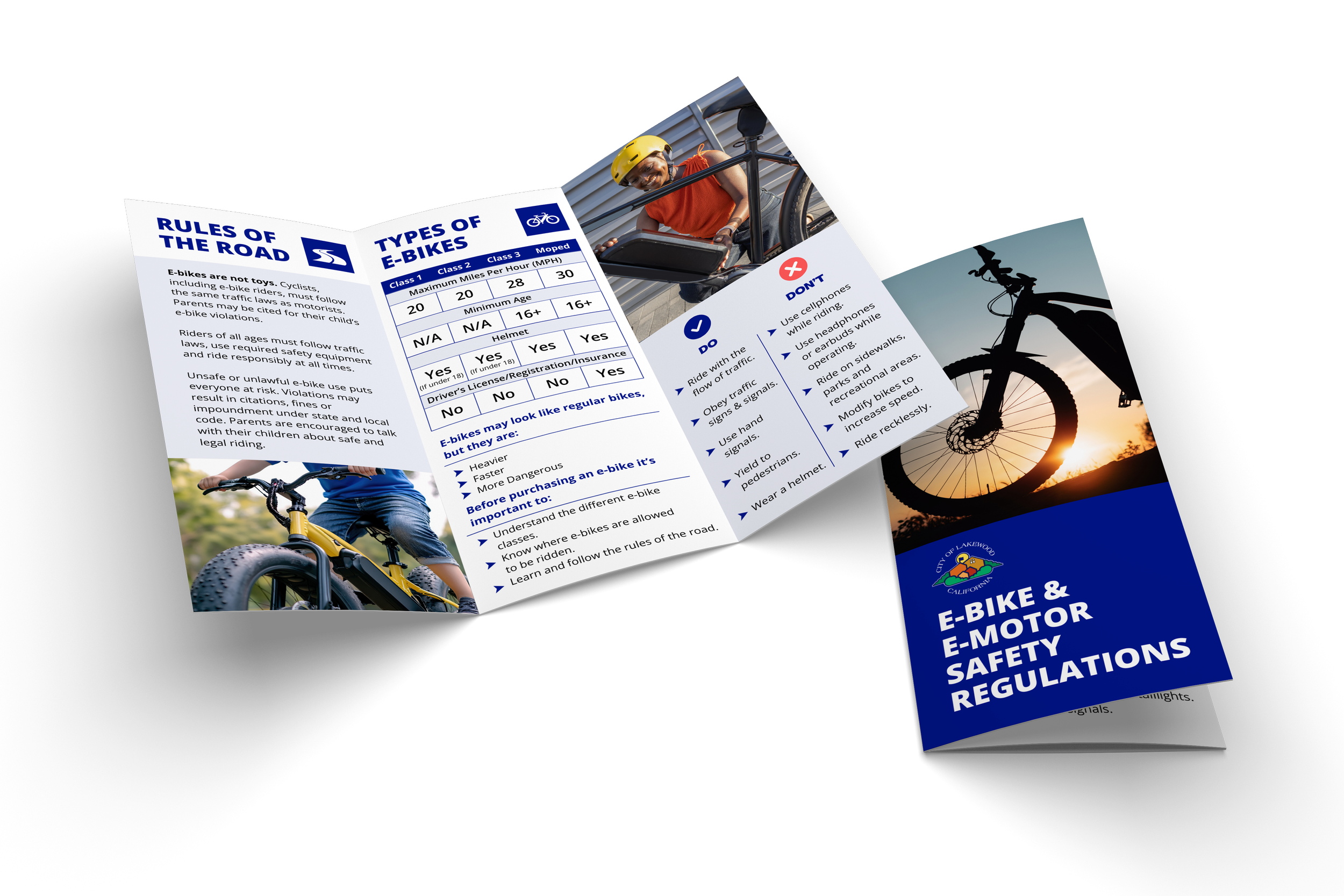 Educational public safety brochure created in response to increased e-bike usage and community safety concerns. The tri-fold format organizes complex regulatory information into clear, accessible sections, including class distinctions, legal operation guidelines, and enforcement consequences.